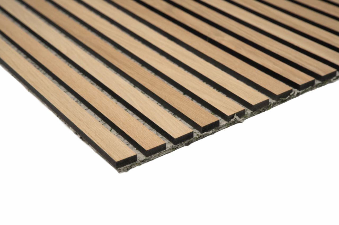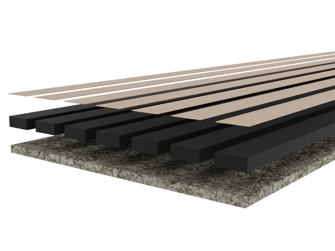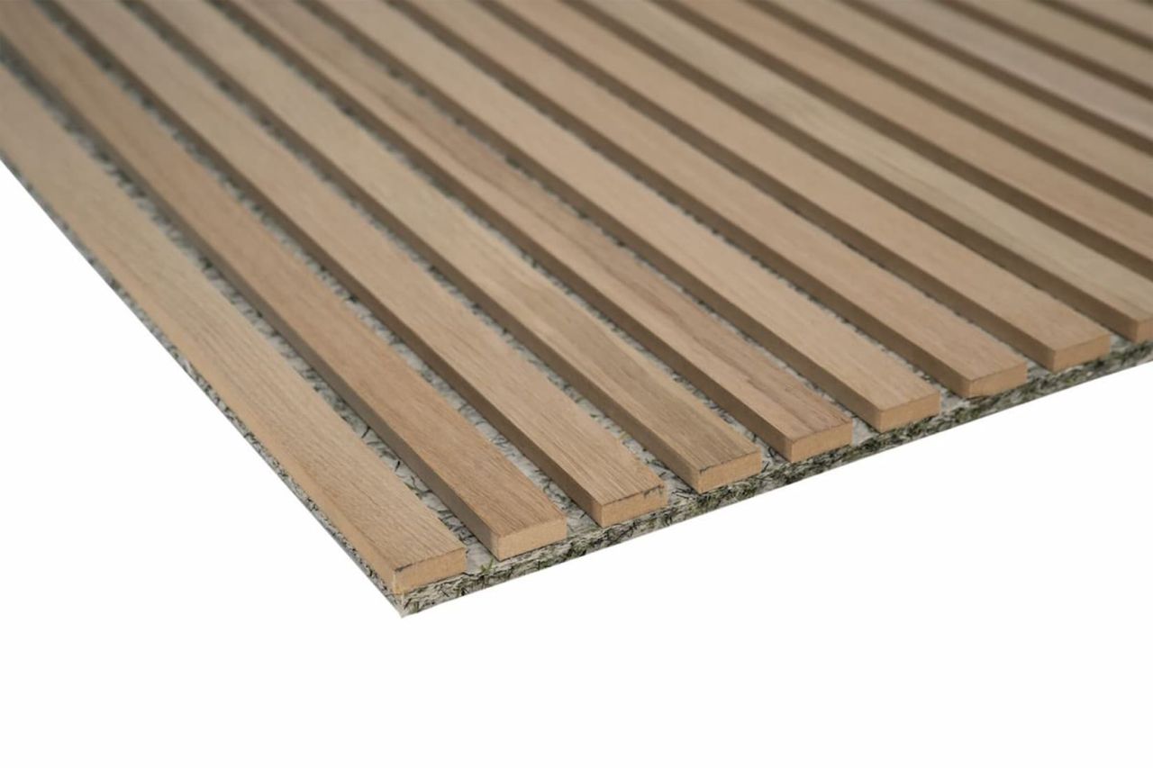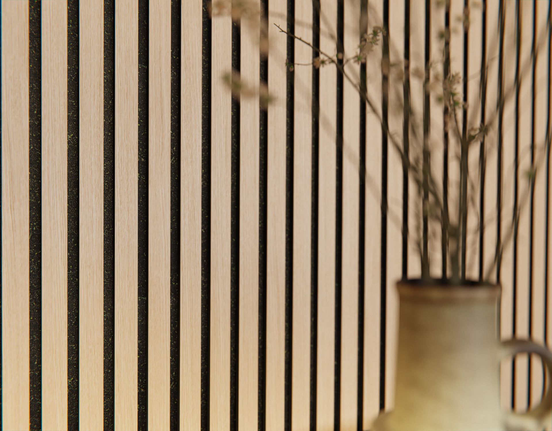 What is special about our Upcycled Turf panel is our felt on the back, which is made of 100% recycled artificial turf that is cut into small pieces and then mixed into a felt, which gives the beautiful and unique expression. Then our MDF slats are mounted with a real wood veneer on the front. This means that nuance differences may occur in the expression of the veneer.